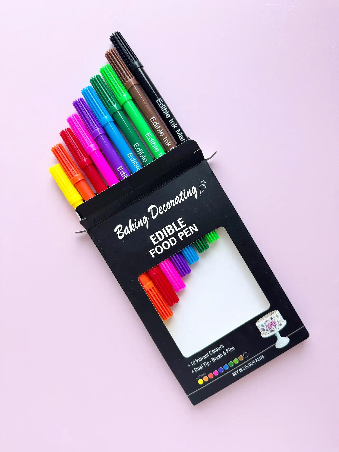 Dieses hochwertige Lebensmittelstifte Set enthält 10 kräftig pigmentierte Farben, ideal zum Verzieren von Fondant, Royal Icing oder trockenen Zuckerdekorationen. Jede Farbe ist doppelseitig nutzbar – mit einer feinen Spitze für Details und einer dicken Spitze für Flächen und Schriften.
