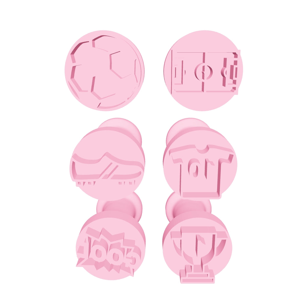 Die Stempel lassen sich ideal mit Mini-Ausstechern wie Kreis, Etikett oder Labelform kombinieren und ermöglichen detailreiche Aufleger, Pokalverzierungen oder sportliche Keksplaketten.